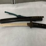 模造刀 拵え 短刀 刀身 木刀 小柄小刀付(在銘 井上和泉守国貞 武将家紋)を安城市のお客様よりお買取りしました。